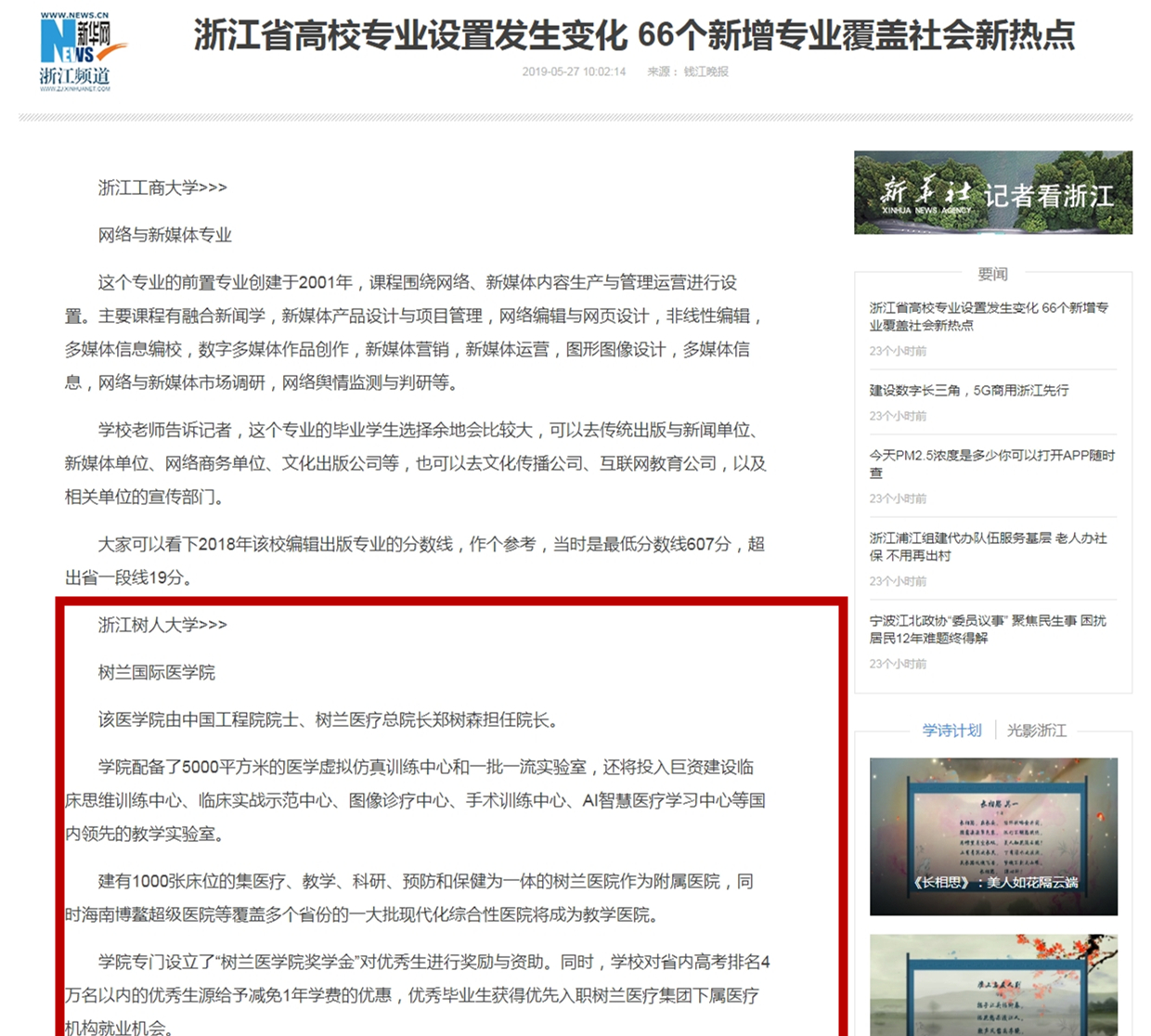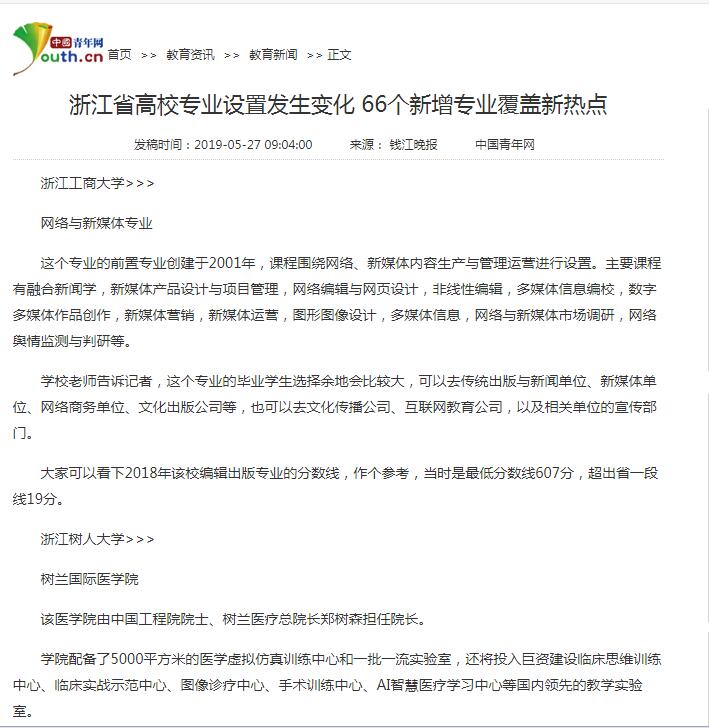5月27日,钱江晚报《高考季》专栏推出了《我省高校专业设置发生变化:66个新增专业覆盖社会新热点》的报道,关注了浙江树人大学(304永利集团官网)树兰国际医学院的情况,对医学院进行了介绍和宣传。新华网、央广网、中青网、浙江在线、浙江新闻、杭州网等30多家媒体进行了转载。