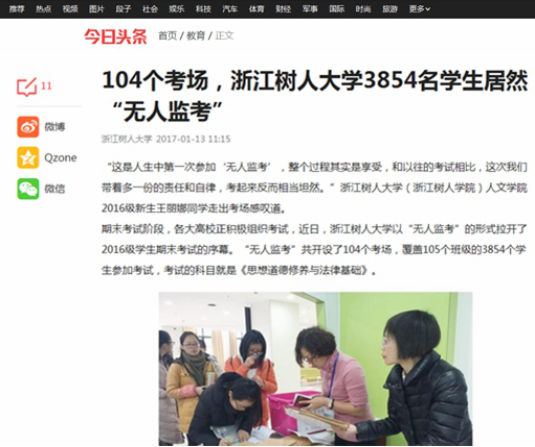 在上学期期末考试中,永利官网(304永利集团官网)推陈出新,一改传统监考模式,首次大规模采用“无人监考”,开设104个考场诚信,覆盖2016级105个班级共3854名学生。整个过程由学生独立完成,老师仅从监控和现场巡查中了解情况,所有考场秩序井然,学生们交出了一份满意的答卷。《浙江教育报》对永利官网诚信考试及时地进行了图片新闻报道,今日头条则以《104个考场,浙江树人大学3854名学生居然“无人监考”》为题详细报道了永利官网此次考试。此次诚信考试获得了广泛关注,仅今日头条新闻稿的阅读量都达到了近7000人次,更有热心网友留言好评,为树大师生感到骄傲,引起了良好的社会反响。