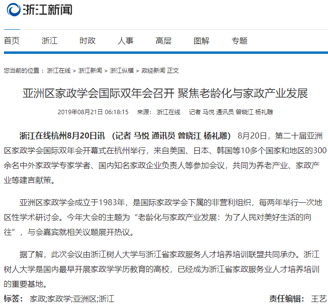 8月20日——8月23日,由永利官网与浙江省家政服务人才培养培训联盟共同承办的2019年第二十届亚洲区家政学会国际双年会在杭州召开。来自日本、韩国、新加坡、马来西亚、菲律宾、泰国、印度、喀麦隆、美国、中国台湾、中国香港等10多个国家和地区的中外家政学专家和学者共300余人参加会议。此次会议上产生了由18人组成的新一届执委会,校长徐绪卿当选亚洲区家政学会执行委员会委员,这也是该学会成立36年来,中国大陆唯一当选的执委会委员。学习强国、光明日报、人民网、浙江日报、杭州电视台、杭州日报等20多家媒体对本次会议进行了宣传和报道。