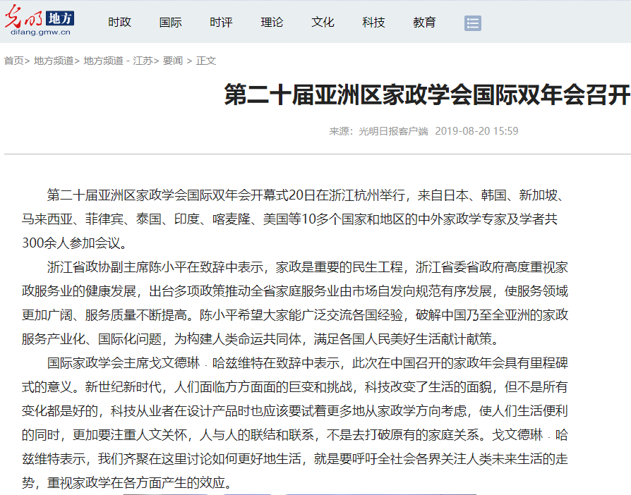 2、光明日报http://share.cloud.gmw.cn/yunmei-share/?shareTitle=第二十届亚洲区家政学会国际双年会召开&shareImg=https://s.cloud.gmw.cn/2016/json/upload/resources/image/2016/12/13/6100070.png&shareDes=&sourceUrl=http://s.cloud.gmw.cn/gmrb/c/2019-08-20/1293265.shtml&articleId=1293265&token=d3181dc8d47b778861757d43f5b3e841&from=singlemessage