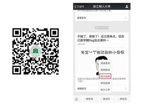 2、进入公众号后,点击“微动态”栏目,可查看树大校报。