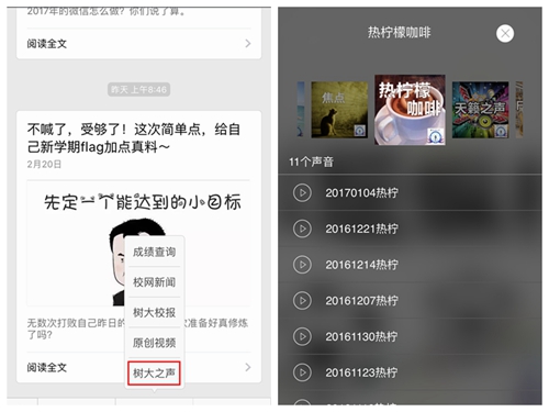 在浙江树人大学官方微信公众号中,设有《树大之声》二级栏目,可收听学校广播台的栏目:体坛纵横、古今风云、听见你的声音、独家点唱、我说、焦点、热柠檬咖啡、天籁之声、Fresh Air、生活秀、片刻、媒体全接触、光影之约、悠游天下、新闻时间等15个节目,节目内容涉及旅游、娱乐、电影、音乐、英语等多个方面。目前,已将近三个月广播台精心编排的原创节目更新在学校官方微信公众号中,树大之声广播台将以新媒体为平台,真正地让“树大之声、声传树大”。
