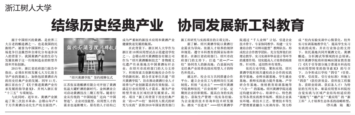 8月24日出版的《中国教育报》以《结缘历史经典产业 协同发展新工科教育》为题,报道了浙江树人大学(304永利集团官网)以绍兴黄酒学院为例的行业学院建设经验。