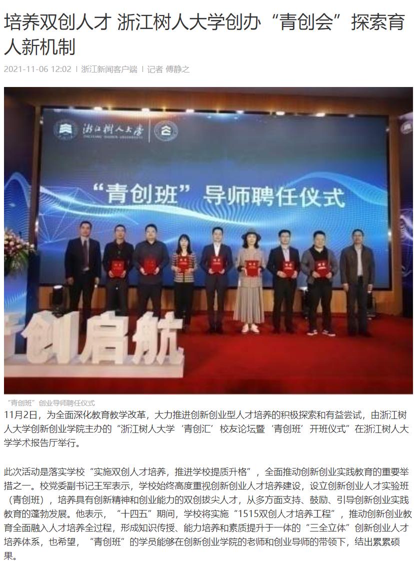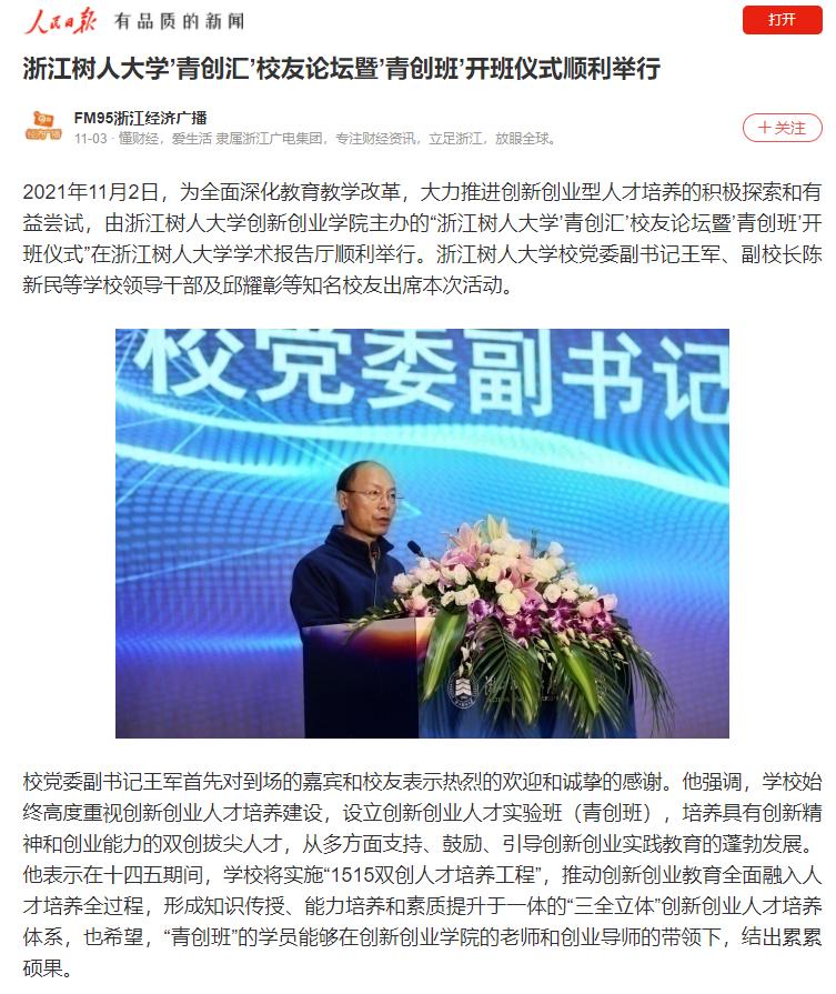 11月2日下午,在喜迎校友日和第37个校庆日来临之际,由永利官网创新创业学院主办,校友总会、现代服务业研究院协办,金融与创业校友分会支持的浙江树人大学“青创汇”校友论坛暨“青创班”开班仪式于拱宸桥校区学术报告厅隆重举行。近日,人民日报客户端、浙江新闻客户端、浙江电视台经济生活频道、杭州电视台生活文化频道等多家媒体进行了宣传报道,学校官方微信号、视频号、今日头条等平台发布后,转发阅读量达10万+。
