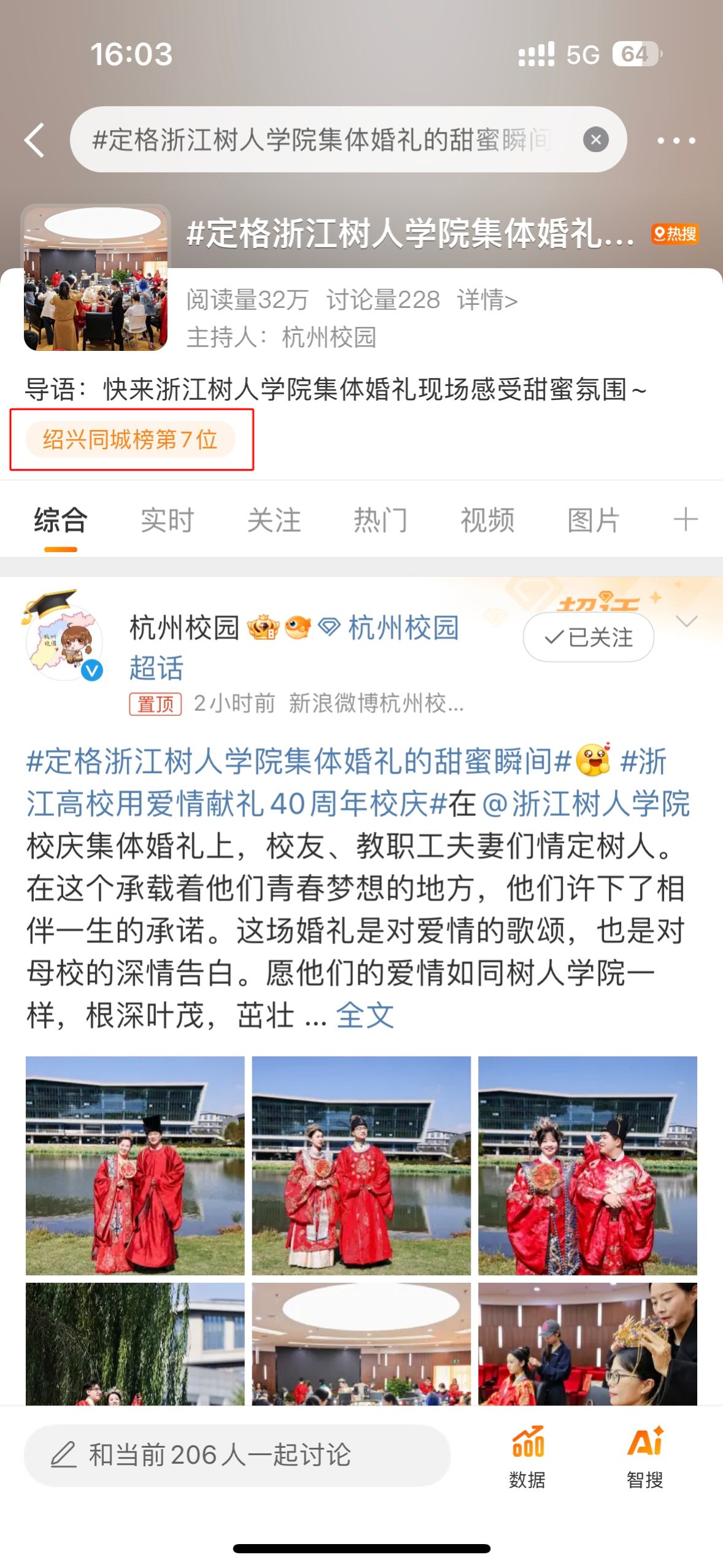 学校官方微博由党委宣传部指导运营。一直以来,学校高度重视校园新媒体建设工作。2024年,学校官方微博发博天数366天,总发博数近5000条,曝光次数超1600万次,单条博文最高转赞评数达31万。微博全年共开设运营40个话题,其中有11个登上同城热搜。学校相关话题中单个最高阅读量达255万,最高位次达到第3位。在建校40周年校庆之际,#304永利集团官网40周年校庆#、#见证浙江高校40年的闪耀华章#等校庆相关话题全网阅读量近500w,78所高校在话题中送上校庆祝福,微博官方账号“浙江校园”“杭州校园”参与互动上百次。