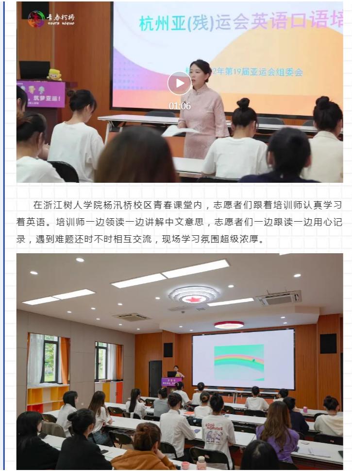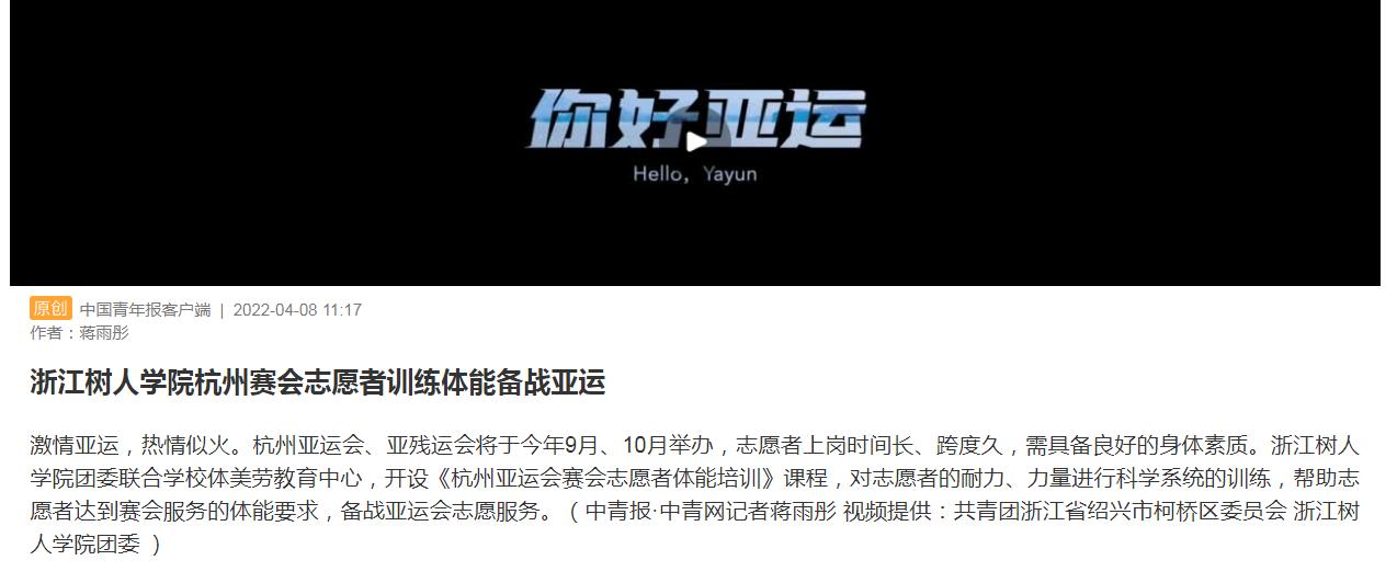为进一步提高永利官网杭州亚运会赛会志愿者的综合素质和服务技能,校团委精心策划了志愿者服务相关培训课程,授课方式采取线上、线下相结合,通用知识培训注重场景化,技能知识培训注重操作性,其中体能训练课程得到中国青年报、浙江卫视、绍兴卫视、青蜂侠、绍兴日报等媒体宣传报告,学校官方微信号、视频号、今日头条等平台发布后,转发阅读量达10万+。
