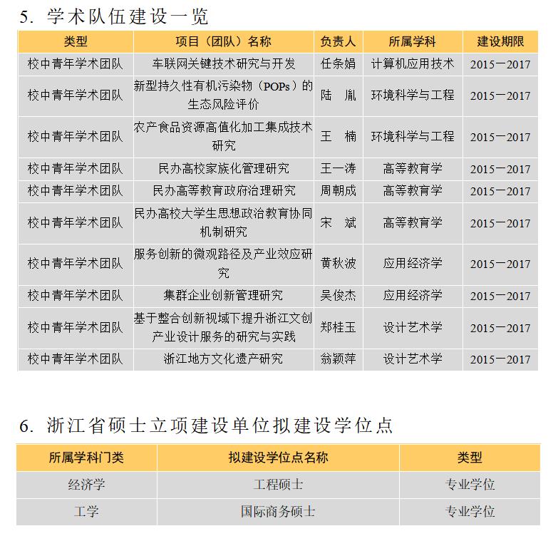 2011年,省哲学社会科学重点研究基地“浙江省现代服务业与经济转型重点研究基地”挂牌运行。省重点学科(A)——国际经济与贸易和高等教育学顺利通过专家组验收;高等教育学入选浙江省社会科学“学科共建”共建学科。与常州大学正式签订联合培养研究生协议。