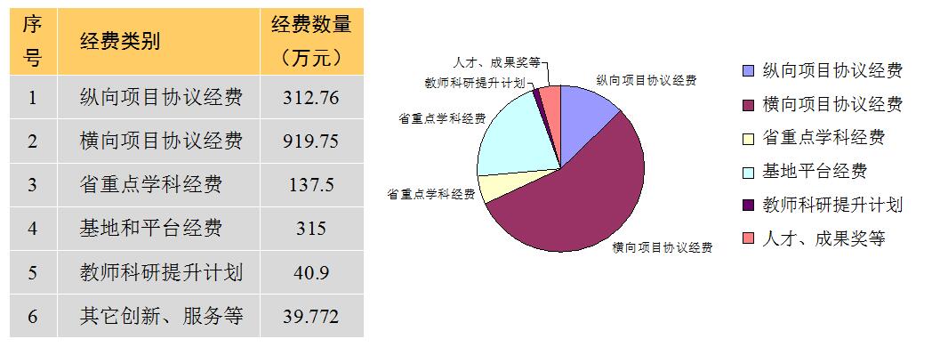 学校科研协议经费共计1765.682万元,实际到账1282.6万元。纵向课题协议经费共297.26万元(其中国家级课题49万元,省部级课题238.6万元,市厅级课题9.66万元);横向课题协议经费918.25万元,省大学生科技创新计划项目经费15.5万元,其他类课题协议经费1.5万元,课题项目协议经费合计1232.51万元。学校还获得学科平台经费501.4万元(包括省重点学科建设经费137.5万元、省哲社研究基地建设费5万元、教师科研提升计划40.9万元、国家外国专家局教科文卫高端外国专家项目8万元、科研创新平台310万元),学科社会服务经费11.772万元,其它创新计划等20万元。全校共立项各类项目251项,其中国家级项目2项,国家外国专家局教科文卫高端外国专家项目2项,省部级项目31项,市厅级项目38项,省大学生科技创新项目31项,其他项目9项,横向科研项目立项89项(其中10万元以上的横向项目数量达33项),校级科研计划项目49项。