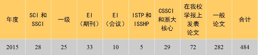 全校科研成果在往年基础上继续稳步增长,质量和数量逐步提升。全校教职工在各类学术期刊发表论文484篇,其中被SCI和SSCI收录28篇、EI收录43篇、ISTP、ISSHP收录5篇,人大复印资料全文转载3篇,权威论文3篇,一级论文19篇,CSSCI和浙大核心论文29篇;出版学术专著和译著8部;获授权发明专利11项、实用新型专利30项、外观设计专利51项(其中指导学生获得的外观设计专利45项)、计算机软件著作权73项;获浙江省哲学社会科学优秀成果奖三等奖1项、厅级成果奖2项。