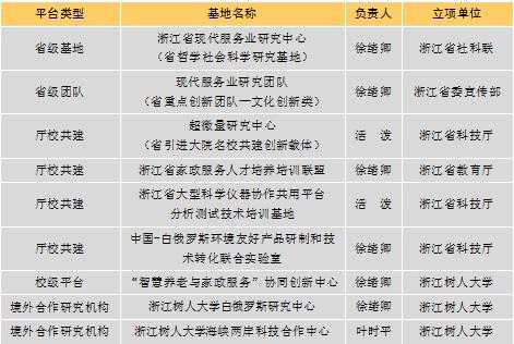 目前,学校拥有1个省哲学社会科学研究基地和1个省重点创新团队,建有省引进大院名校共建创新载体、“浙江省家政服务人才培养培训联盟”、“省大型科学仪器协作共用平台分析测试技术培训基地”、 “中国-白俄罗斯环境友好产品研制和技术转化联合实验室”4个厅校协作共建研究机构,建立了“智慧养老与家政服务协同创新中心”1个校培育性平台,设有“中国民办高等教育研究院”、“陶瓷研究所”等23个校级研究机构,还成立了“浙江树人大学白俄罗斯研究中心”和浙江树人大学海峡两岸科技合作中心2个境外合作研究机构。学校继续重视高等教育学、应用经济学、设计艺术学、计算机应用技术、应用化学、结构工程、环境科学与工程7个省重点学科的建设,同时积极组织“十三五”省一流学科申报,高度重视专业硕士学位申报工作,把申硕工作作为学科建设的重要抓手,确立了建筑与土木工程、环境工程及国际商务3个申硕培育点。到2015年,学校具有硕导资格的教师共27名,累计培养硕士研究生50余人,为“十三五”学科平台建设及申硕工作奠定了良好的基础。