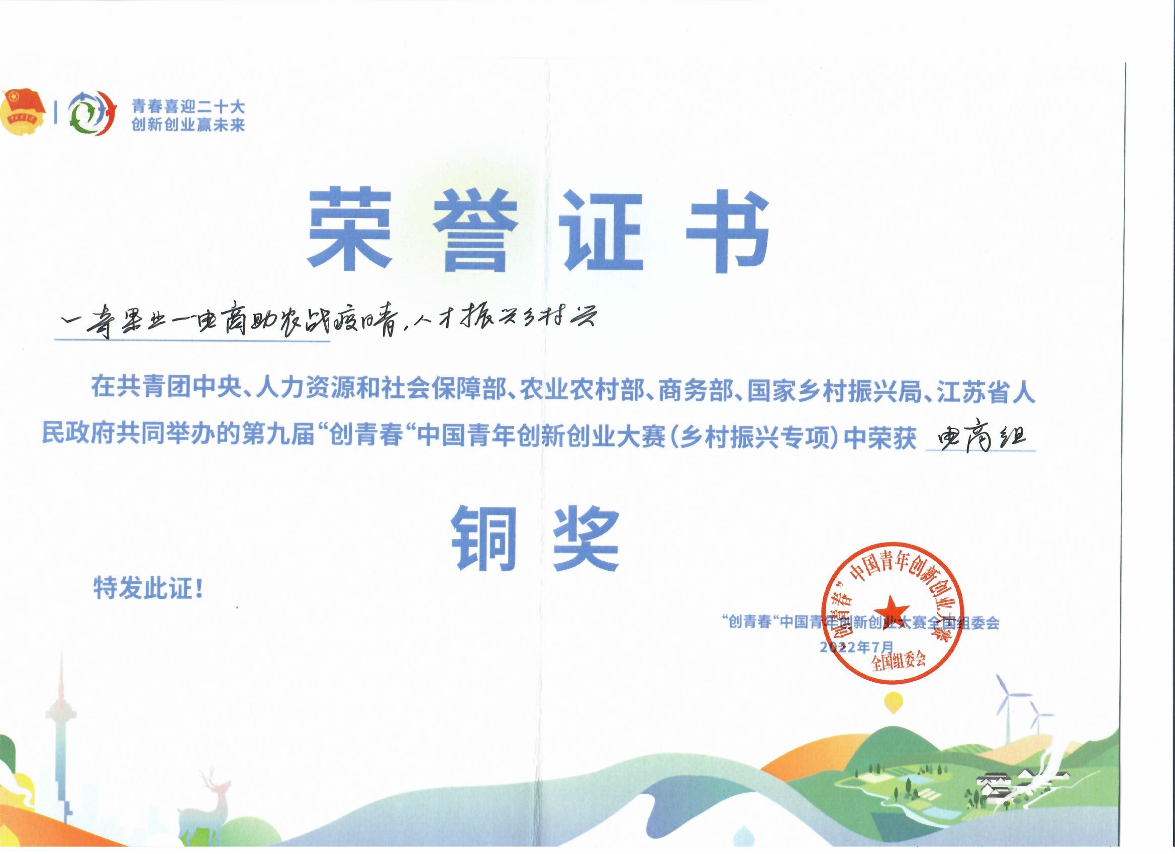 “创青春”中国青年创新创业大赛由共青团中央、人力资源和社会保障部、农业农村部、商务部、国家乡村振兴局等共同主办,是青年创新创业的重要活动品牌,已累计吸引48.8万支青年创业团队、近210万名创业青年参赛,深受青年喜爱、社会关注。今年举办的第九届大赛,以“青春喜迎二十大,创新创业赢未来”为主题,聚焦国家重大战略、重点产业、重要工程等导向,围绕科技创新、乡村振兴、数字经济、社会企业4个领域分别举办专项交流营和创业赛事,为青年创业者提供创业辅导、展示交流、资本对接、专项培训等支持,打造团组织、青年创业者、社会创服机构共创、共享、共赢的青年创新创业嘉年华。其中,乡村振兴专项赛聚焦先进种植养殖技术、农产品加工及销售、农业社会化服务、乡村休闲旅游等,自启动以来,共吸引了全国5178个乡村振兴创业项目报名参赛,经过长达半年的初赛、半决赛、决赛等环节,通过线上项目资料评审、现场路演答辩等方式进行,最终创新组、初创组、成长组、电商组四个组别共评选出金奖12个、银奖26个、铜奖42个和优秀奖若干。王一爽团队获得的正是乡村振兴专项赛电商组国铜!