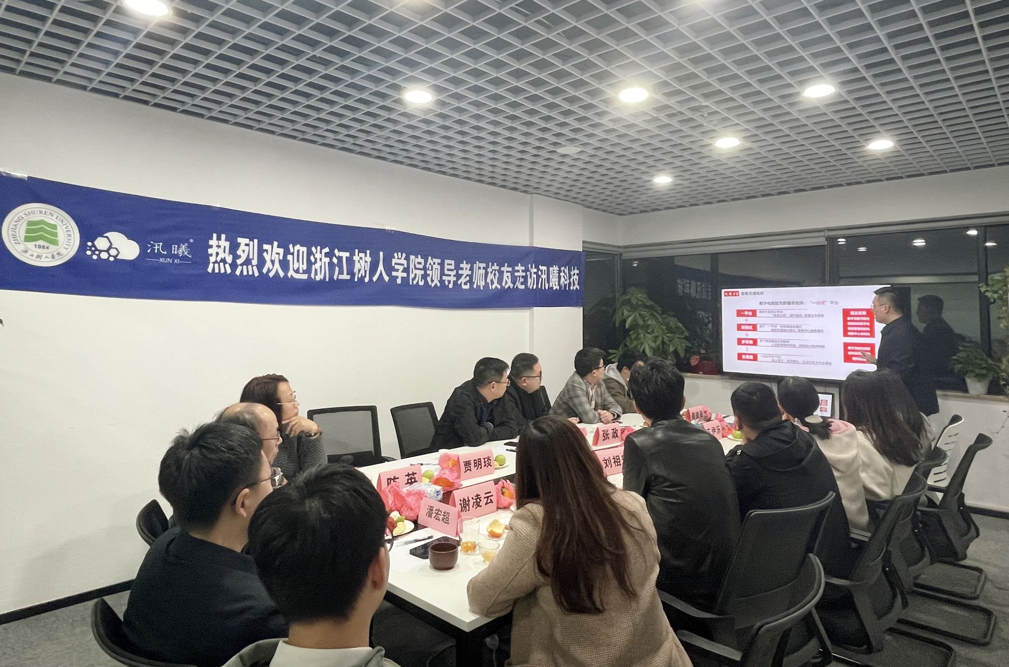 调研中,潘宏超校友讲述了自己的创业历程,对于母校、创新创业学院以及经济与民生福祉学院在其创业发展道路上给予的关心、支持和帮助表示衷心的感谢。他表示,汛曦公司虽然成立时间不长,但发展势头较好,规模成长迅速,目前拥有员工百余人,其中约50%是树大校友,他希望通过创业团队的共同努力,能够在服务社会、造福百姓的同时,反哺母校,以创业带动就业。他也表态,在努力创业的同时,将继续参加“互联网+”等双创竞赛,助推公司发展,为母校争得荣誉。接着,创业合伙人周皓杰校友作为汛曦公司主汇报人,向与会嘉宾介绍了公司的发展历程、主营业务、规模效益、未来规划等。随后,刘川瑞、徐馨兰等校友作为汛曦公司员工代表,表达了对母校的感激之情。