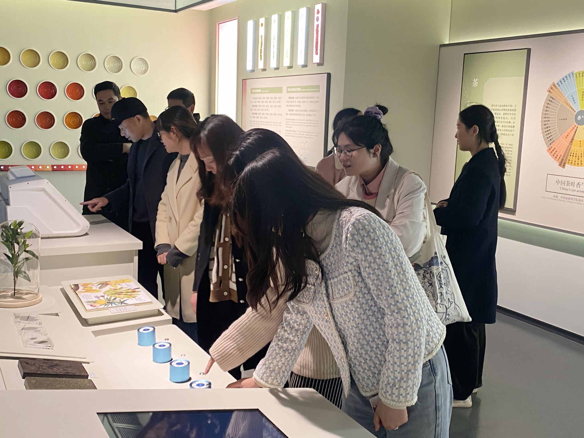 老师们沿着茶间小径漫步至位于龙井路88号的中国茶叶博物馆双峰馆区。馆长包静校友热情接待了双创学院一行。在馆员汪佳璐校友的陪同带领和专业解说下,大家参观了馆内展品,了解制茶杀青、揉捻、干燥等工序,感受承载了千年历史和民族记忆的传统老手艺;认识茶的种类,并近距离体验不同类型的茶香,在醇厚的茶香中,感受传统茶文化的魅力;知悉茶从药用到饮用的历史演变,走进宋代点茶工艺,深入了解我国茶文化历史的源远流长。