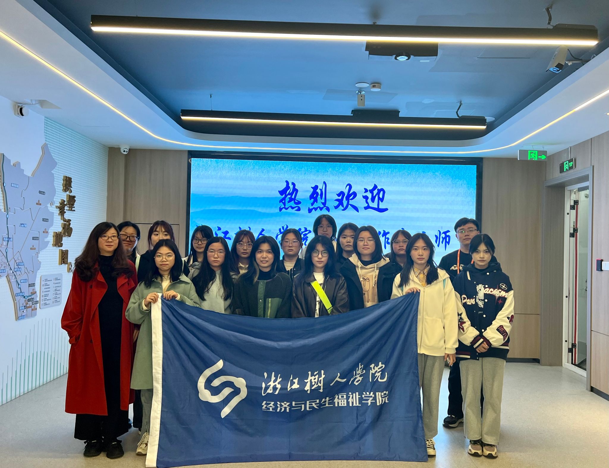 另一行师生来到彭埠街道社会工作站,接待大家的是社会工作站站长,社会工作2007届校友王敏珠。社工站整洁明亮的大厅让人眼前一亮,同学们跟随学姐一步步解锁了中心的各个区域,此处不仅有休闲娱乐的露天球场更有城市书房,而五楼的老年区域更是开辟了理发师,体检室,艾灸室供老人们活动休息,集合式的社区服务集中体现了社区服务的效率,此外社区组织还为年轻创业者开创了孵化平台。王敏珠回忆了美好的校园生活,正是学校里的社会实践、志愿服务经历给她的工作打下扎实的基础。