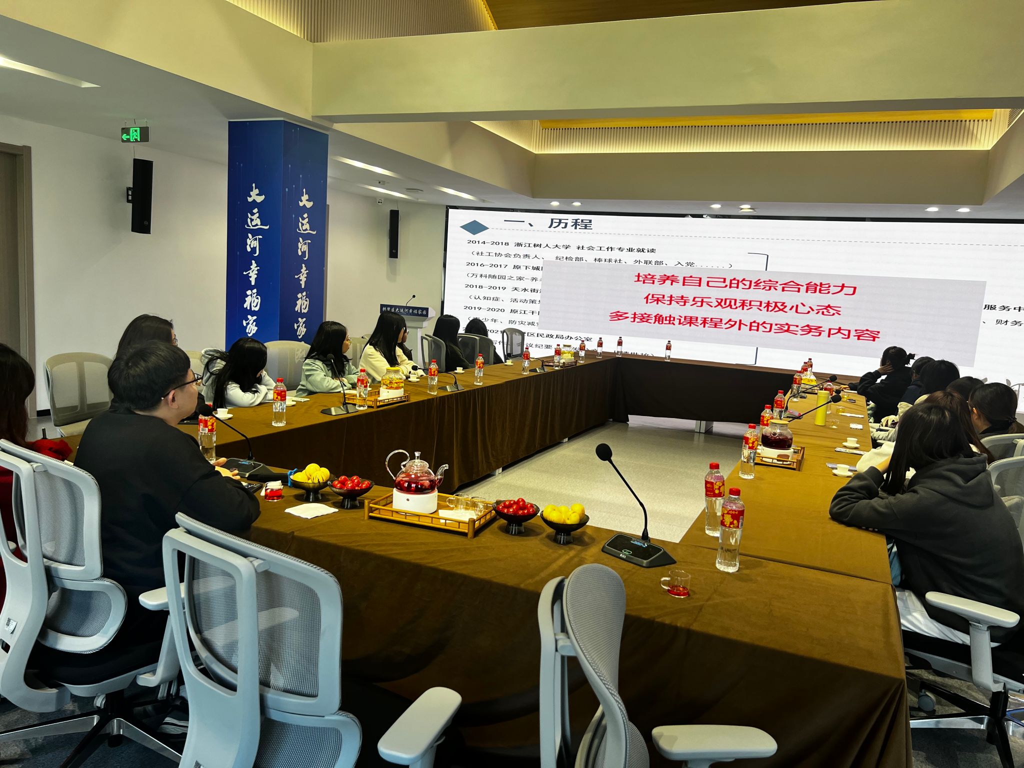 一组师生来到杭州益墅家社会组织服务中心,该中心的负责人是永利官网社会工作2018届校友周华祥。自2013年中心成立以来,益墅家为拱墅区社会组织开展政策指导、智力支持、能力培训、项目指导、法律咨询、财务服务、宣传报道等方面的支持服务,发挥区级社会组织中心的枢纽作用,引导社会组织从居民的需求出发,提供各种公益服务。在学长的带领下,同学们认真参观了整个服务中心,服务内容涵盖百姓的生活需求、艺术陶冶到数字科技,一应俱全,另外,中心每一层的布置都有其相对应的含义:感受光,追随光,成为光,散发光。这也正是社会工作坚守的初心和理念。周华祥还为同学们分享了中心创办历程和工作中的所感所获,帮助学弟学妹们增强专业认同感,感受社工大家庭的温暖与爱。