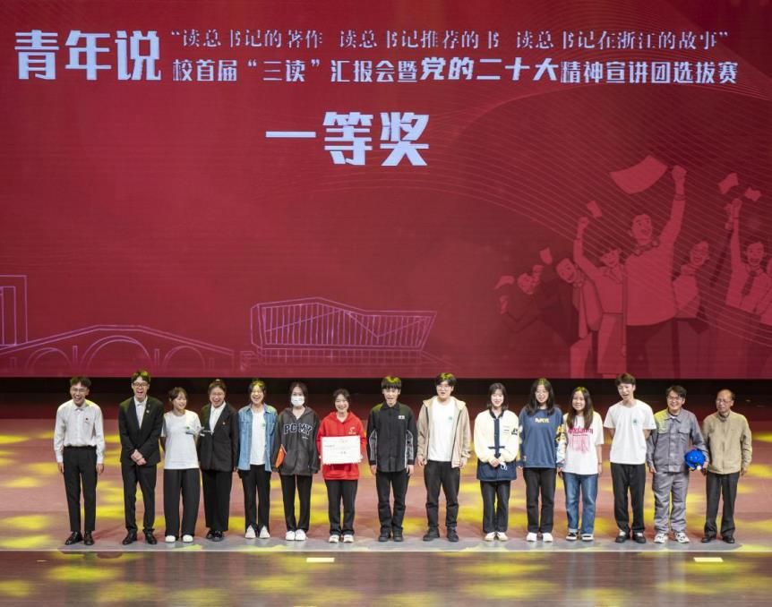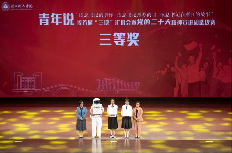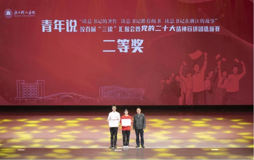 经过紧张激烈的评分后,三读”汇报会暨党的二十大精神宣讲团选拔赛奖项揭开面纱:来自经济与民生福祉学院的“青春之语”宣讲团荣获一等奖,来自管理学院“‘习语润吾心’管理新声”宣讲团、人文与外国语学院“与你在‘浙’里学‘习’”宣讲团荣获二等奖;来自信息科技学院的“驭梦”宣讲、城建学院“冉冉宸阳升——阳光”宣讲团、生物与环境工程学院“破茧”宣讲团荣获三等奖。