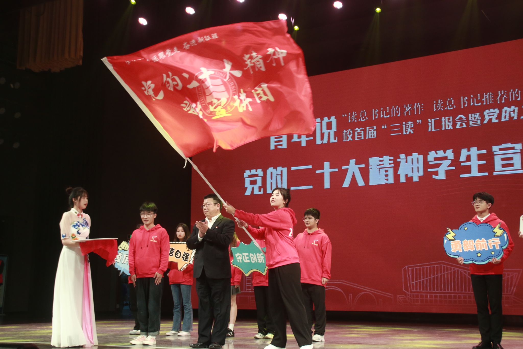 为深入贯彻学习党的二十大精神,将党的声音传递出去,讲好树大故事,校党委书记章清为党的二十大精神学生宣讲团授旗。本次“三读”汇报会也是学生宣讲团的首演,之后他们将紧密联系广大群众的新期待,深入各教室宿舍、深入社区乡村,用青年的口吻将党的二十大精神讲新、讲活,让党的号角传得更加嘹亮,让党的光芒更加耀眼,让党的旗帜永远鲜红。