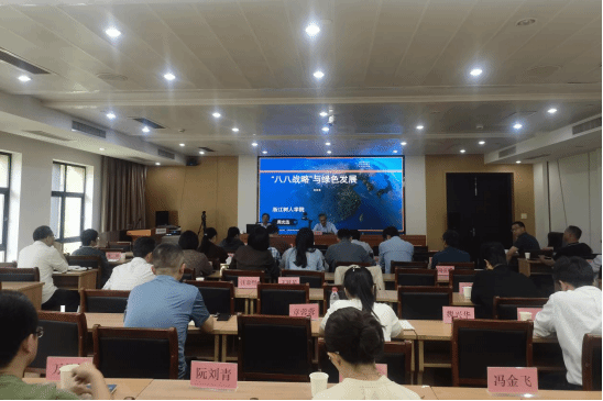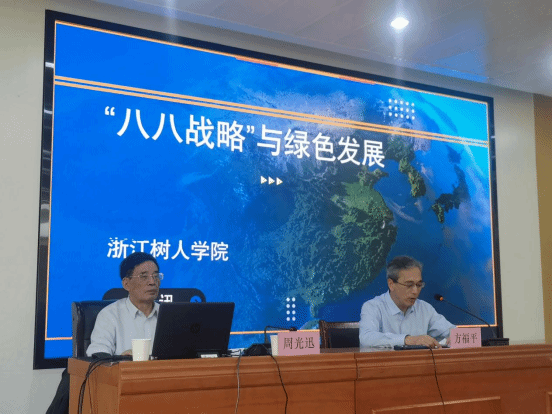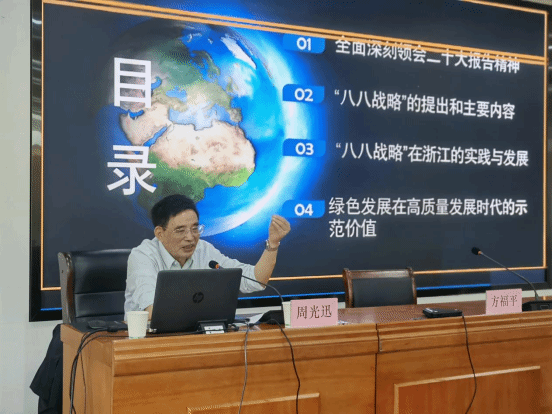 讲座中,周光迅教授从二十大报告精神出发,结合习近平新时代中国特色社会主义思想主题教育要求,详细阐述了“八八战略”的时代背景与主要内容,通过总结回顾“八八战略”在浙江的实践经验及发展历程,分析了绿色发展在高质量发展时代的示范价值,提出了中国式现代化建设的绿色愿景。