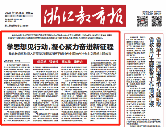 4月25日,《浙江教育报》头版头条“新闻聚焦”栏目《学思想见行动,凝心聚力奋进新征程 我省教育系统深入开展学习贯彻习近平新时代中国特色社会主义思想主题教育》报道永利官网深入开展主题教育。