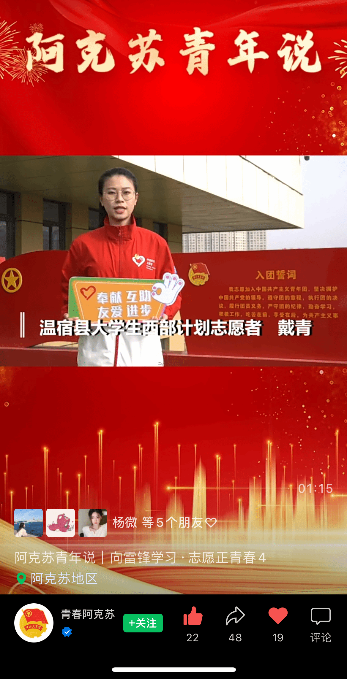 志愿服务是一盏灯点亮一盏灯、一束光照亮一束光的接力赛,志愿服务不仅要帮助有需要的人,更要在社会中形成人人向善、乐于奉献的良好风气。扩大志愿服务影响力,吸引更多人参与志愿服务成为了下一步的工作重点,戴青抓住“人人都是自媒体”的时代浪潮,开设并运行视频号、抖音号、公众号全媒体宣传矩阵,开设相关专栏8个,累计宣发报到160余条志愿服务故事,累计阅读量达54000余次,被石榴云、新疆共青团、新疆卫视、西部志愿汇、中国青年志愿者等上级官媒采纳30余条,对讲好新时代的志愿服务故事进行有效探索。