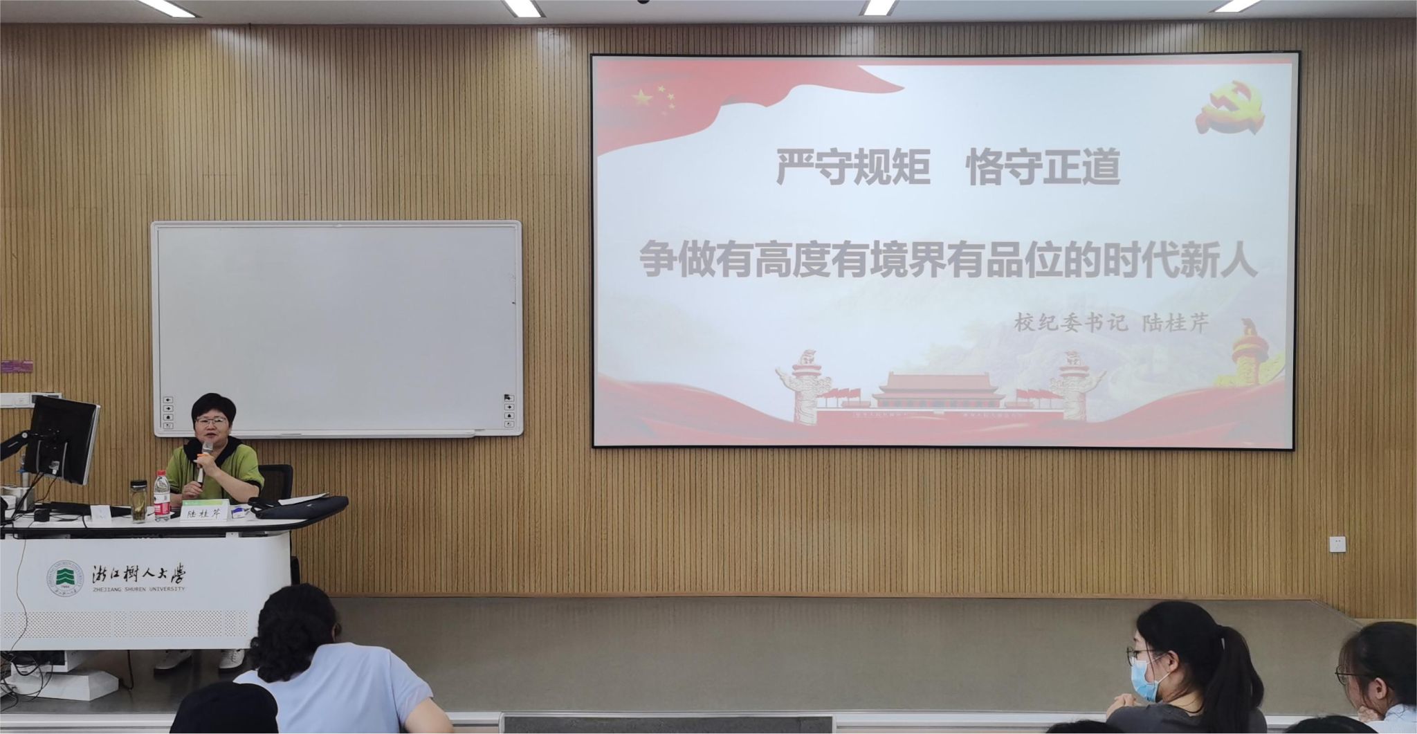 根据学校学习贯彻习近平新时代中国特色社会主义主题教育总体安排,5月30日下午,校纪委书记陆桂芹以《严守规矩 恪守正道——争做有高度有境界有品位的时代新人》为题,在拱宸桥校区B2-209为370名上半年新发展党员做专题党课。杨汛桥校区设立分会场,采取网络直播方式收听收看党课。