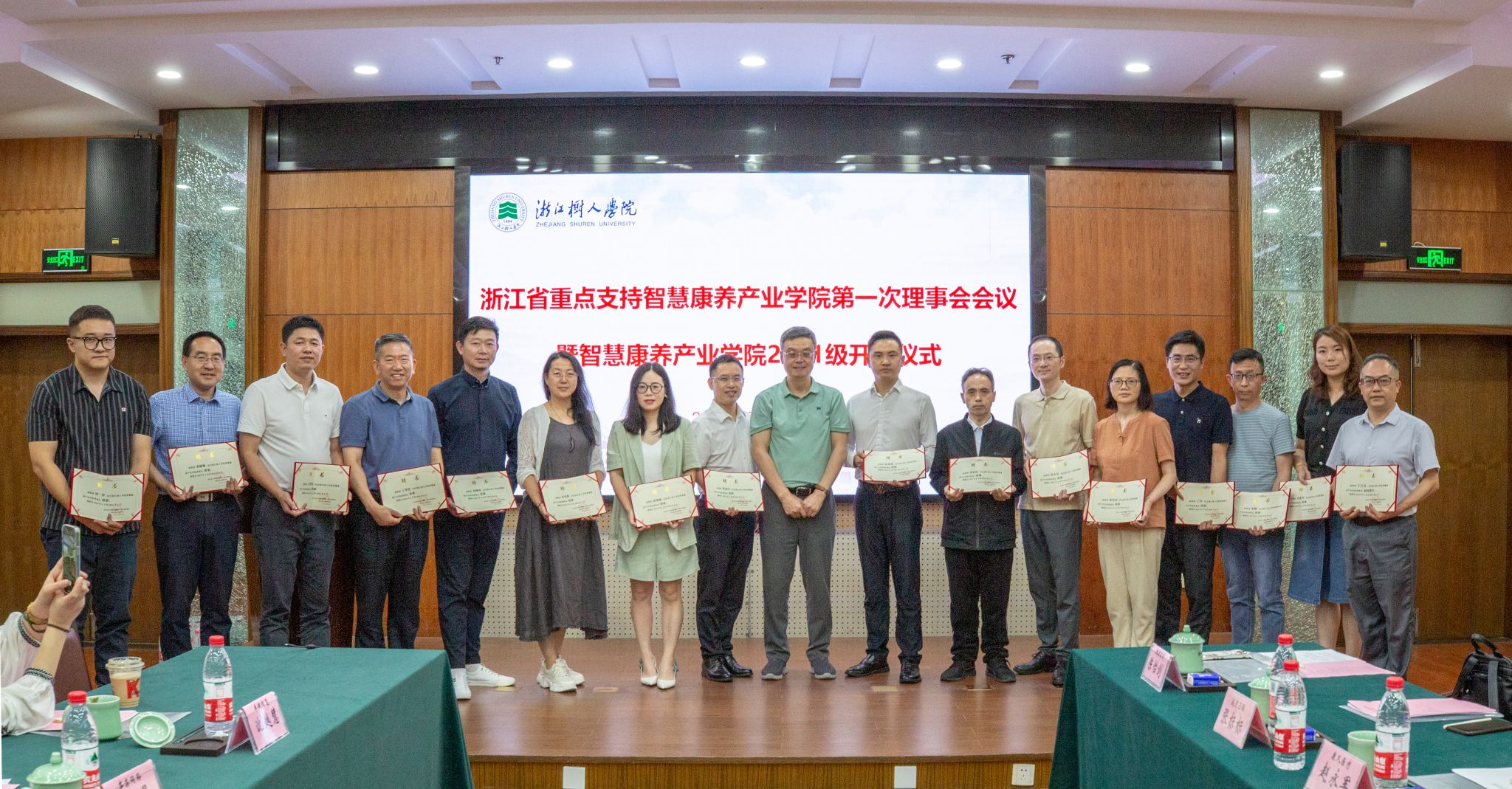 随后,副校长陈新民宣读理事会成员名单,李鲁校长为理事会成员颁发证书并合影。陈新民表示,理事会是产业学院领导体制形式,意味着责任,希望各理事会成员对智慧康养产业学院的建设多做贡献,并从“回归初心”、“创新培养模式”、“校内校外协同育人”三方面提出相关建议。
