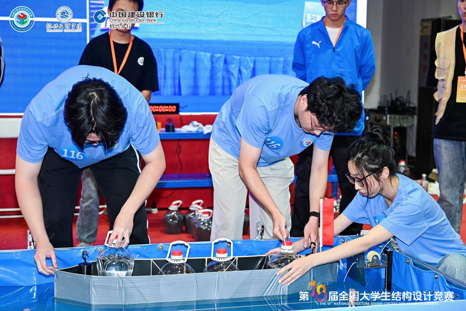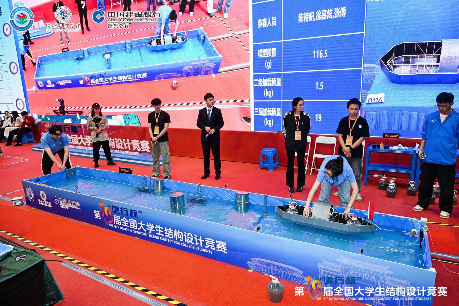 本届竞赛赛题以独具绍兴地方特色的乌篷船为原型,加载砝码采用绍兴黄酒酒坛造型,要求参赛队伍以竹材和防水膜为主要材料,设计制作具备良好稳定性、防水性与抗撞击性的乌篷船模型。在严格的尺寸与性能约束下,选手需兼顾船体流线、结构受力与航行性能等多重指标,完成从理论设计到现场制作、从静态核验到动态加载的全流程考验。