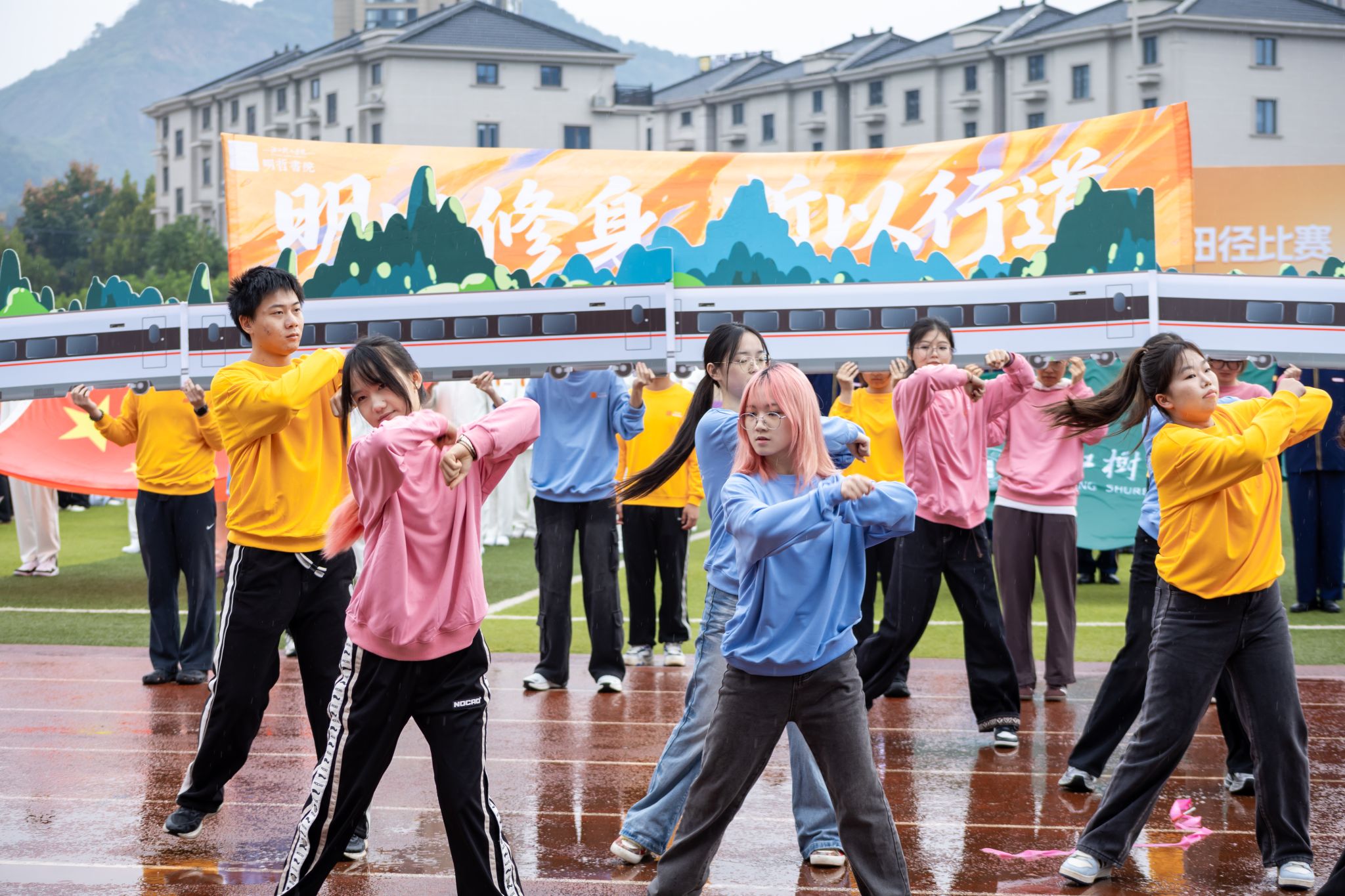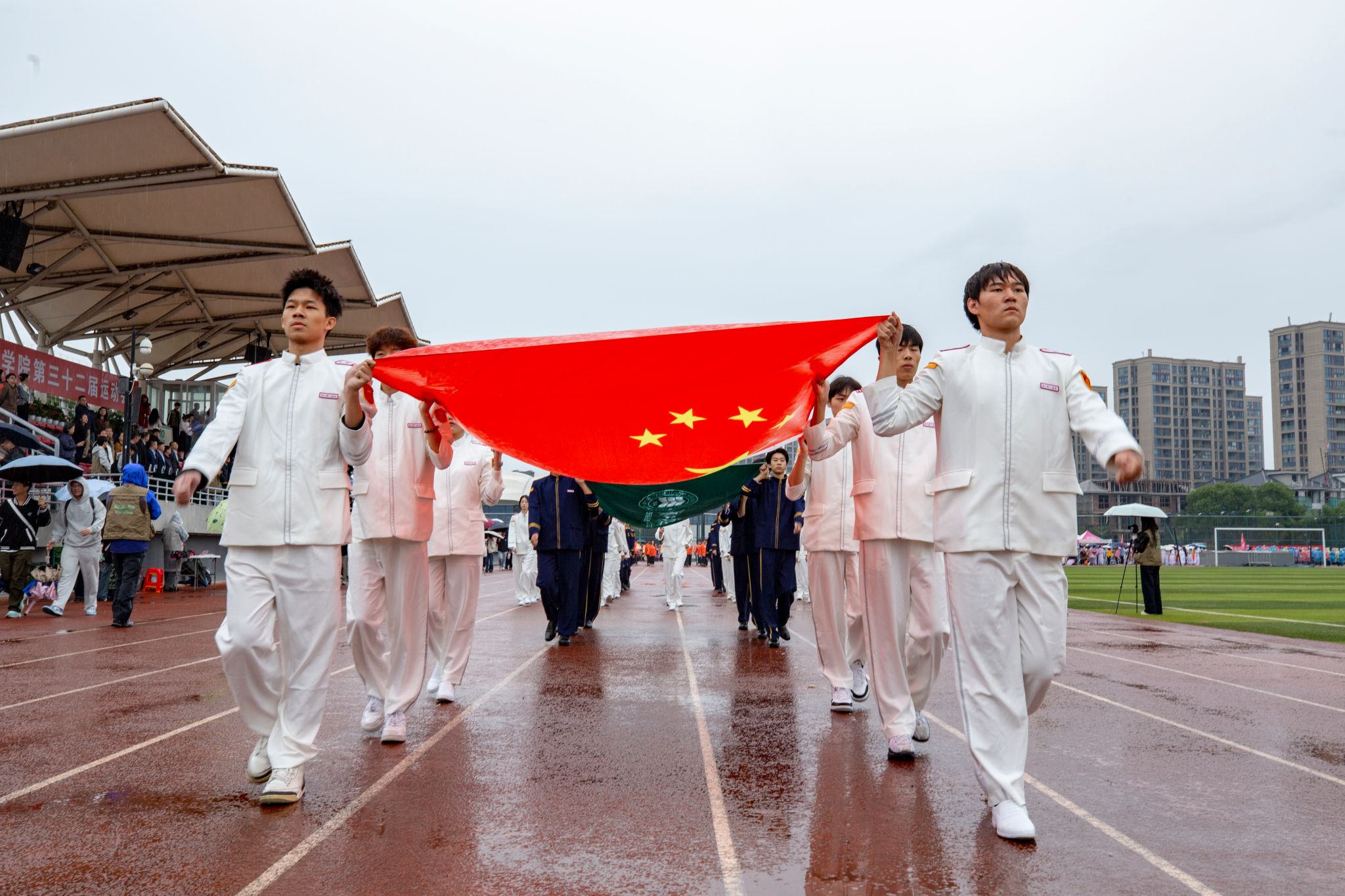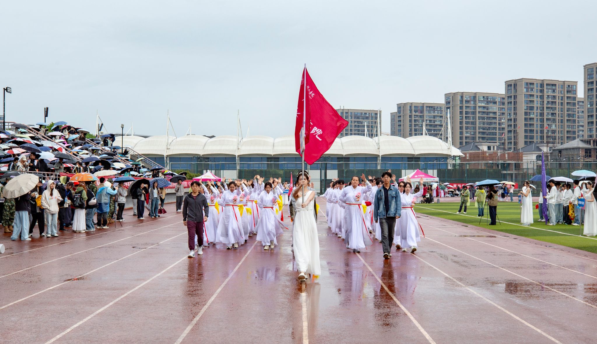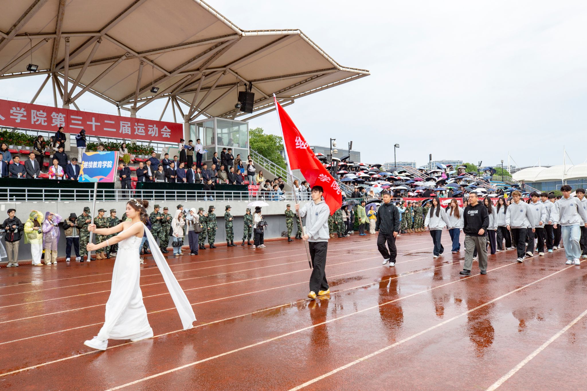 在校旗、国旗护卫队的引领下,崇德书院、重智书院、宸阳书院、明哲书院、毫末书院、继续教育学院及教职工代表队依次入场并表演。