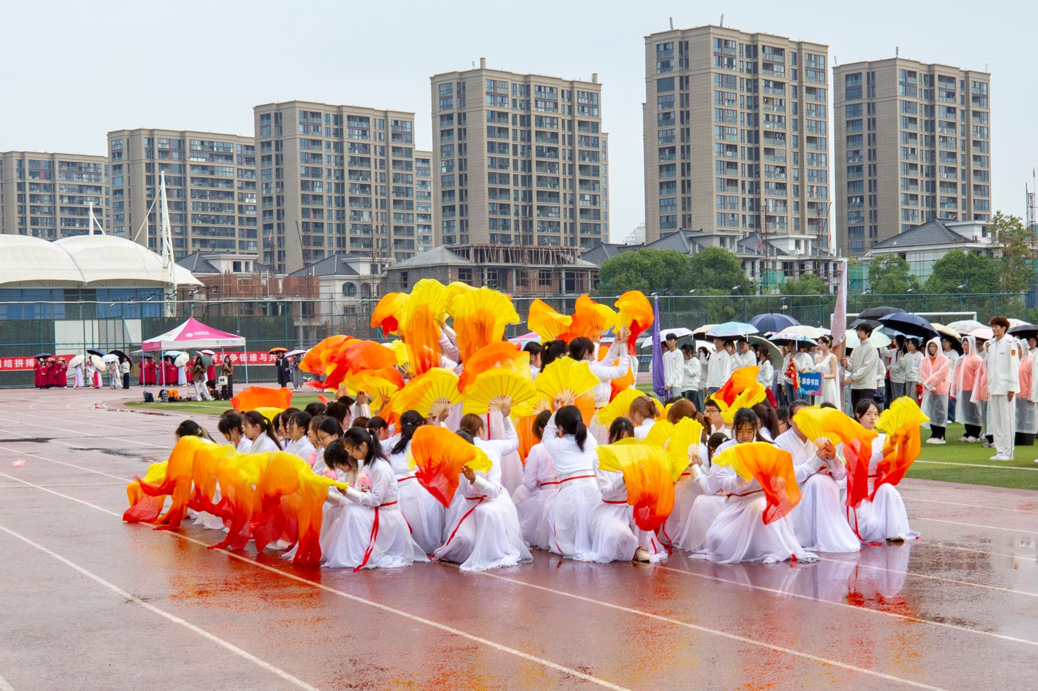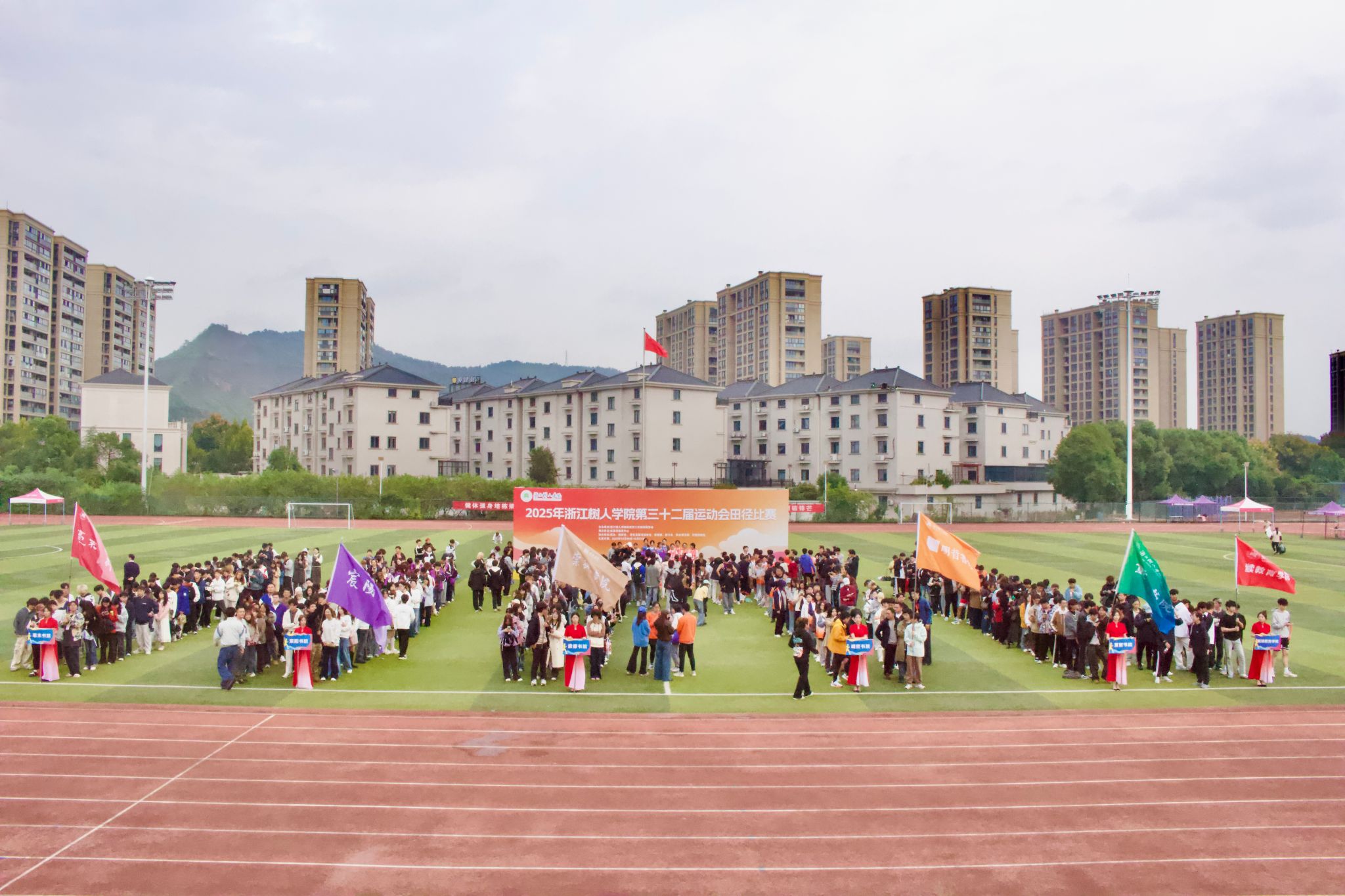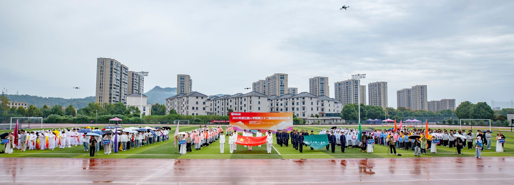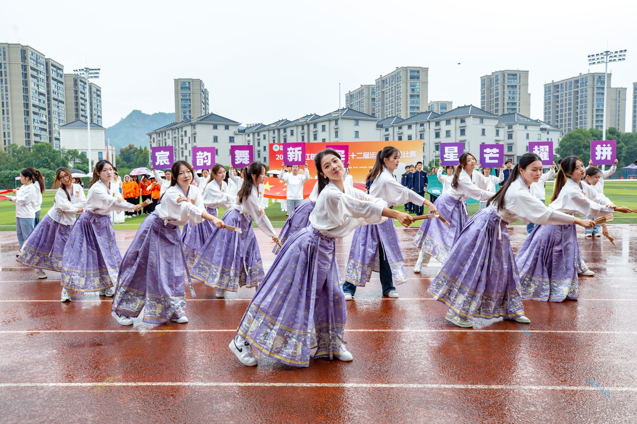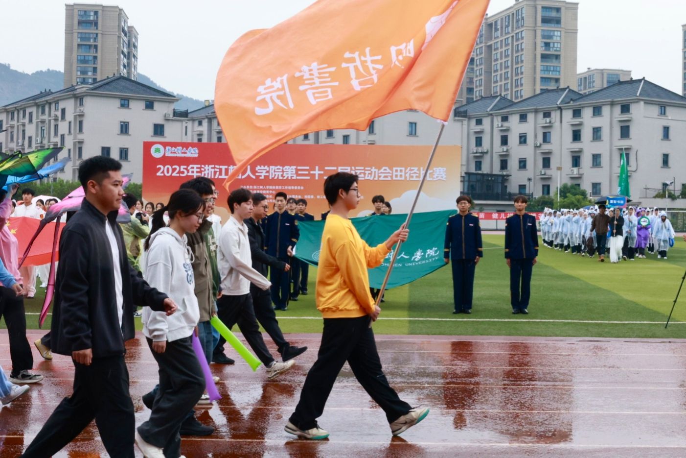 在校旗、国旗护卫队的引领下,崇德书院、重智书院、宸阳书院、明哲书院、毫末书院、继续教育学院及教职工代表队依次入场并表演。