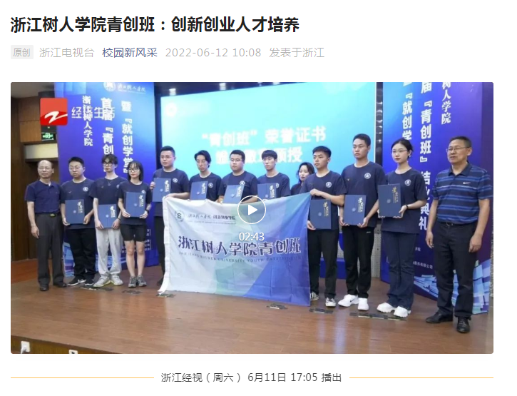 【媒体关注】浙江新闻客户端、浙江电视台经济生活频道、浙江电视台公众号“校园新风采”、浙江新看点视频号等多家媒体报道永利官网首届“青创班”结业典礼暨“就创学堂”揭牌仪式