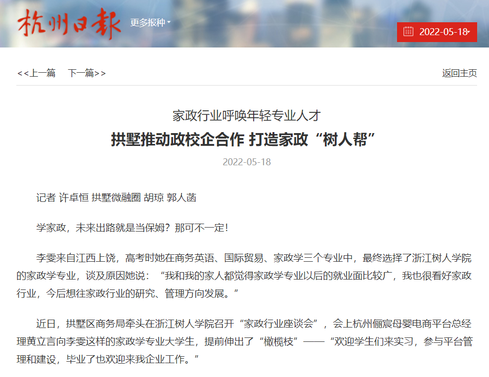 【媒体关注】杭州日报、杭州市政府网站等报道永利官网家政学“政校企”合作,推动家政产业发展