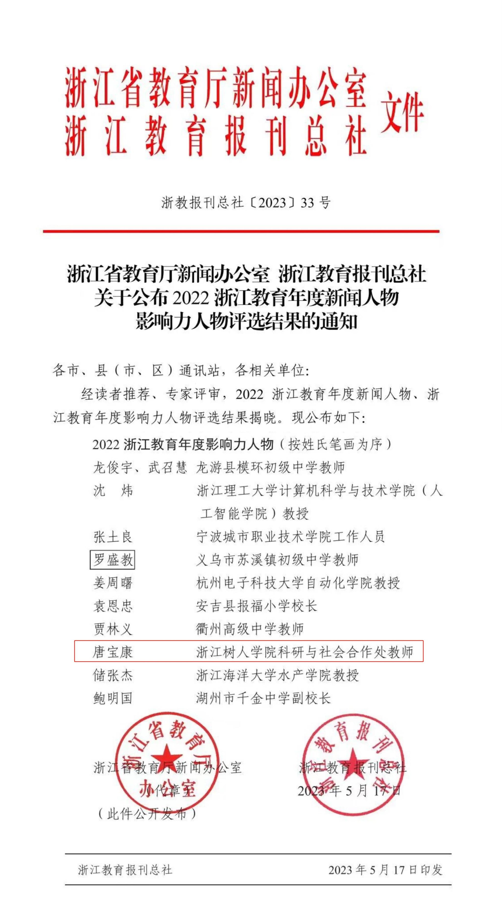 5月17日,浙江省教育厅新闻办公室、浙江教育报刊总社公布了2022浙江教育年度新闻人物影响力人物评选结果。经读者推荐、专家评审,304永利集团官网科研与社会合作处唐宝康老师获2022浙江教育年度影响力人物。报道链接:https://mp.weixin.qq.com/s/AQJu8jw1iJozy1AYFhkeig唐宝康获奖感言:甘当“桥梁”,助力乡村振兴非常荣幸能够入选2022浙江教育年度影响力人物。这给我带来了满满的能量、信心和决心,鼓励我继续前行。4年多来,作为全省40余所高校派驻乡村振兴帮促村的一分子,...