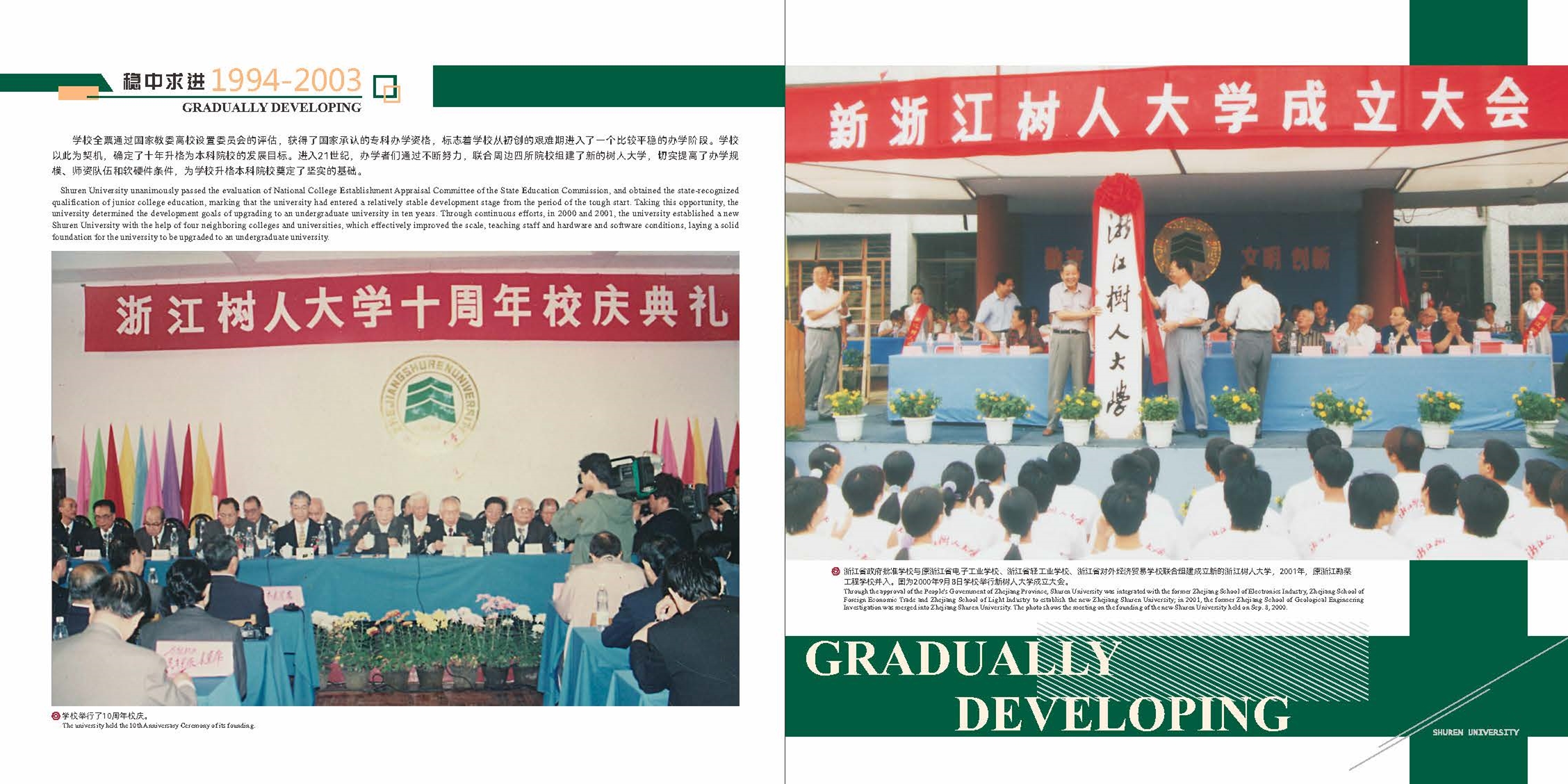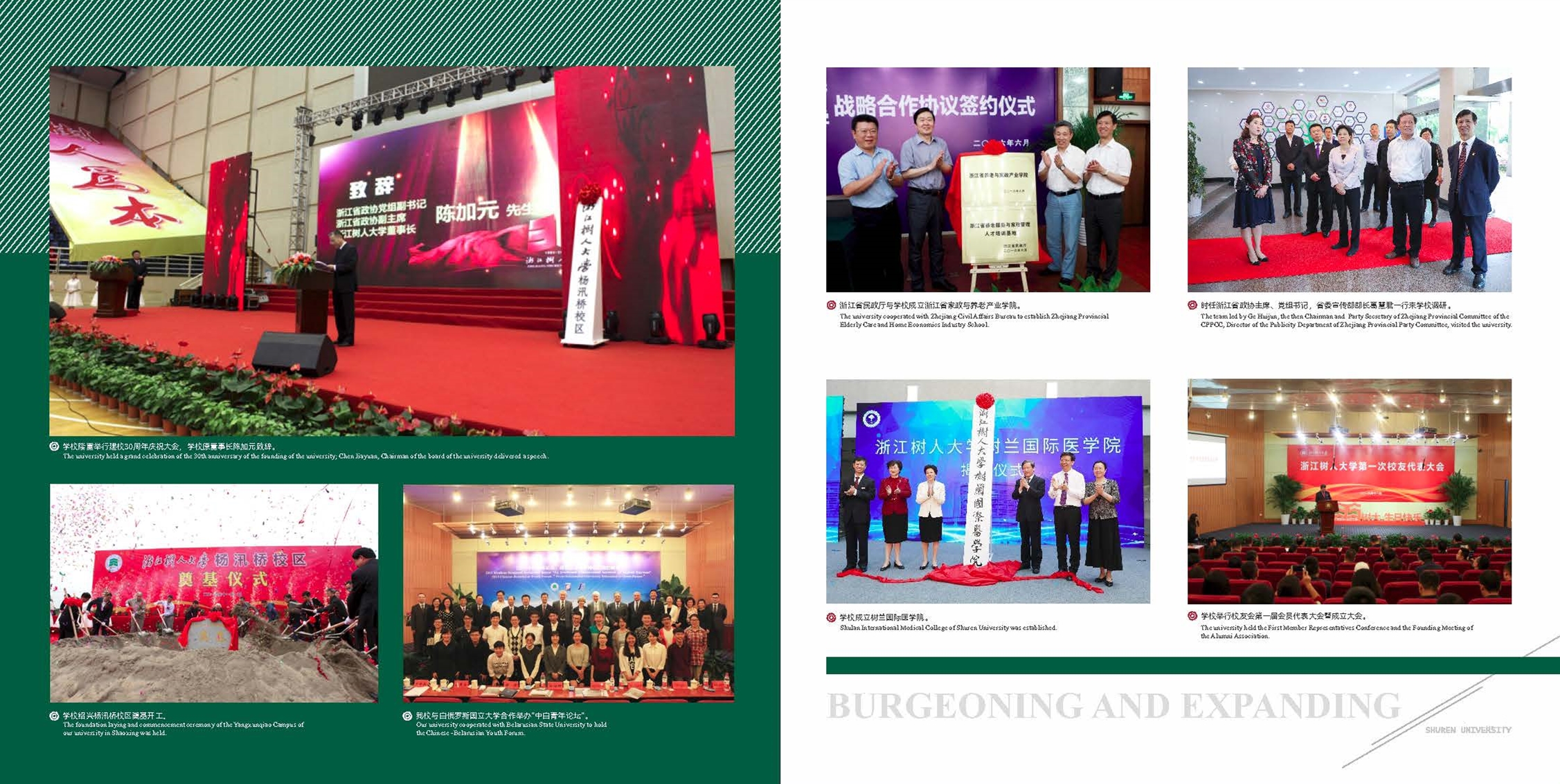 40年来,学校一步一个脚印,实现了一次又一次的跨越发展。1984年,获浙江省政府批准成立,成为我国首批成立的四所民办高校之一;1985年,首届102名学生入学;1993年,通过国家教委高校设置委员会评估,成为首批获得国家承认学历的全日制民办高校;2000年,浙江省政府批准学校与原浙江省电子工业学校、浙江省轻工业学校、浙江省对外经济贸易学校联合组建成立新的浙江树人大学;2001年,原浙江勘察工程学校并入;2003年,学校升格为本科院校,实现了办学层次的新飞跃;2007年,通过学士学位授予权评估;2011年,通过教育部本科合格评估;2014年,浙江省政府批准永利官网在绍兴柯桥建立杨汛桥校区;2015年,被确定为浙江省首批应用型试点示范建设学校;2016年,占地800亩的绍兴杨汛桥校区启用,“一校两区”全面运行,实现了办学规模的新飞跃;2020年,提出“以学科建设为引领,推进学校提质升格”办学目标;2021年,确定坚定不移走特色质量发展之路,着力实现从“民办名校”到“名校民办”新跃迁。