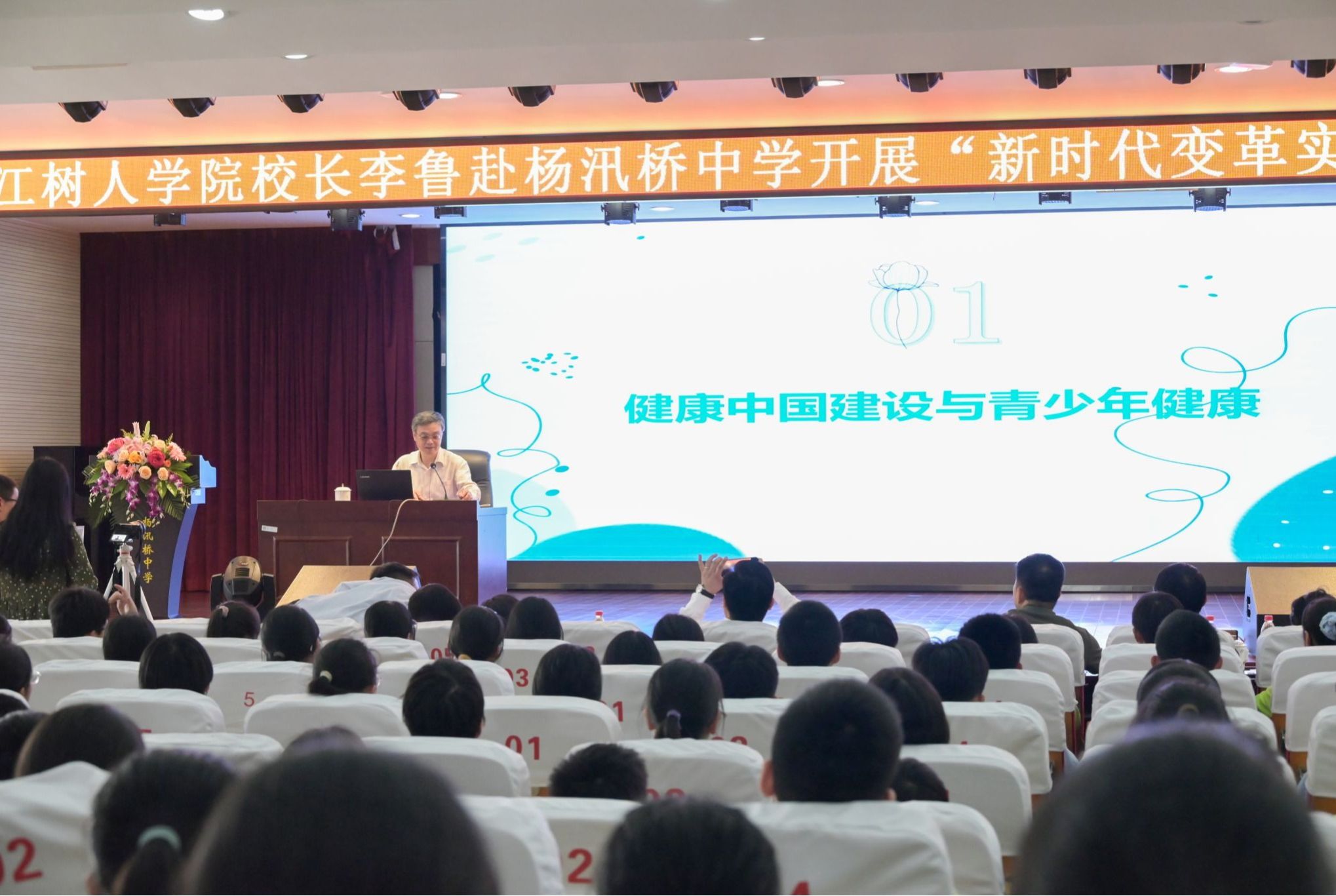 为深入贯彻落实新时代教育改革精神,推动育人模式创新实践,4月28日,校长李鲁教授赴杨汛桥中学,以《健康中国,从我做起》为题,为七年级学生带来了一场生动的“新时代变革实践”大思政课。柯桥区委教育工委专职副书记、区教体局党委副书记、副局长钱春风,杨汛桥中学书记、校长吴红红等出席活动。作为健康浙江行动专家咨询委员会副主委、浙江大学医学院博士生导师,李鲁从“健康中国建设与青少年健康”讲起,告诫同学们:“青年兴则国家兴,...